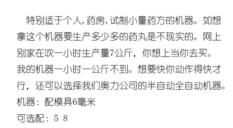 3. 本機(jī)適用性強(qiáng),可生產(chǎn)各種粘度的軟、硬藥丸,制丸合格率高,特別適合于小型藥廠試制室,中藥研究所、醫(yī)院、藥房及保健、食品成丸生產(chǎn)。
